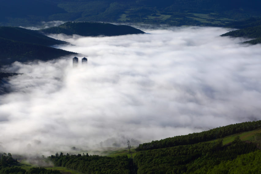 In central Hokkaido it is possible to watch a "sea of clouds" (unkai in Japanese). This sea of clouds is a climatic phenomenon and entirely depends on the weather conditions; in facts it can be observed only during the warmer months, when the hot and warm air currents meet in the valley, and as a result, thick clouds cover everything so that one has the impression of floating in the air. The best time of the day is before sunrise, so plan ahead if you want to check it out. There is a platform with a cafe, where visitors can sit and chill while waiting for the clouds to form.