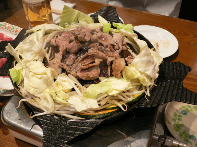 The name of this dish is "Genghis Khan", but really it is mutton meat grilled on charcoals. So, it is basically yakinuku (grilled meat in Japanese), but it has this peculiar name in Hokkaido as it was believed that this was the meat eaten by the Mongol populations, whose leader was the infamous Genghis Khan (the Mongols actually didn't invade Japan). Curiously enough, this style of cooking, and the use of mutton meat, is a specialty of Hokkaido only. Foodies going to Hokkaido, make sure to try this dish.