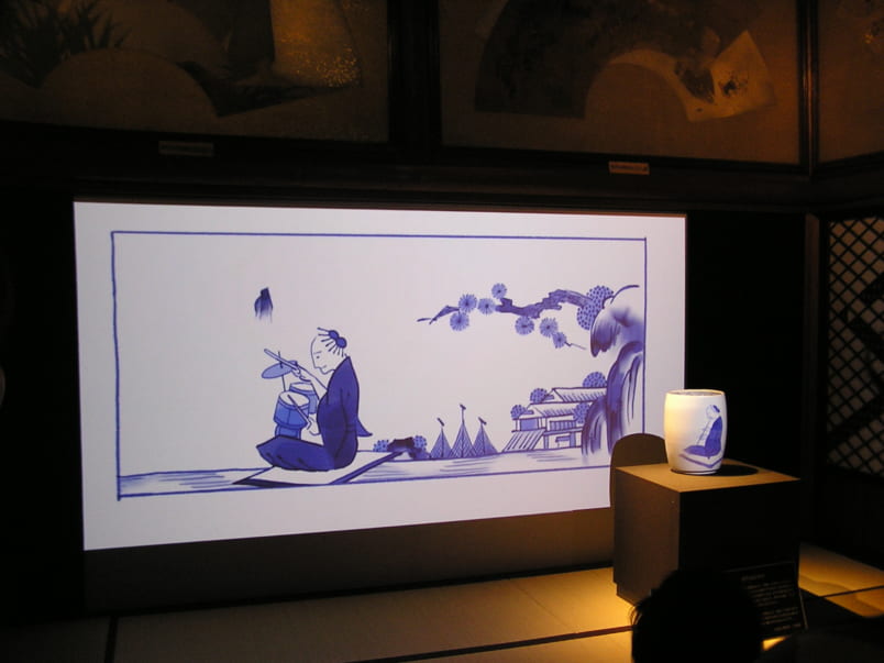 Kaburagi Kiyokata was a prolific artist and pioneer of nihonga, a style of Japanese art. His beautiful works grace the walls of Kaburagi no Ma (鏑木の間). The Wa no Akari display here is a short and humorous animation projected against a white screen and porcelain vase.