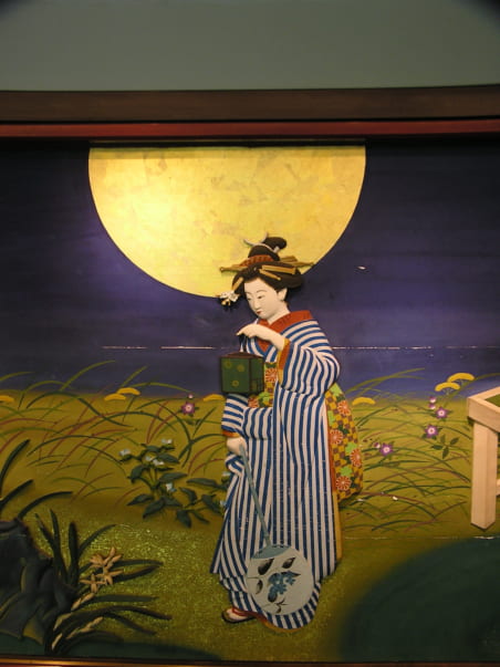 On my visit in July, my group and I were awed by the 100 Step Staircase, and the seven rooms flanking it. Standing at the foot of the stairs looking up, I was also moved, knowing that when she was 17 or 18, my Japanese grandma bustled up and down this very staircase. As an employee, she wore a kimono and carried up trays of food and drink for guests. My grandma tells me she interviewed for the vied position at the prestigious Gajoen Hotel and was among less than twenty women out of hundreds who had applied. It was at Gajoen that she received her education in calligraphy, flower arranging, calligraphy. With such accomplishments, Gajoen gained a reputation as the perfect place for an eligible bachelor to search for his bride! During her time, the hotel kept live monkeys and a peacock. The peacock would give a wake up call in the morning, saying "Ne-yo! Ne-yo!" which, ironically, sounds like the Japanese for "Go to bed! Go to bed!"