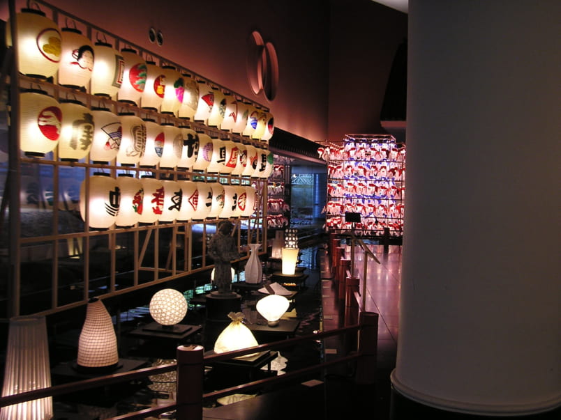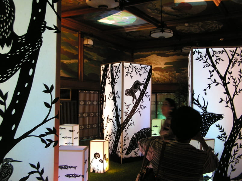 In Gyoshō no Ma (漁樵の間) the large-sized dramatic light sculptures, featured on the Wa no Akari posters, fit surprisingly well with the traditional paintings of fishing scenes and the traditional carvings on the wooden pillars.