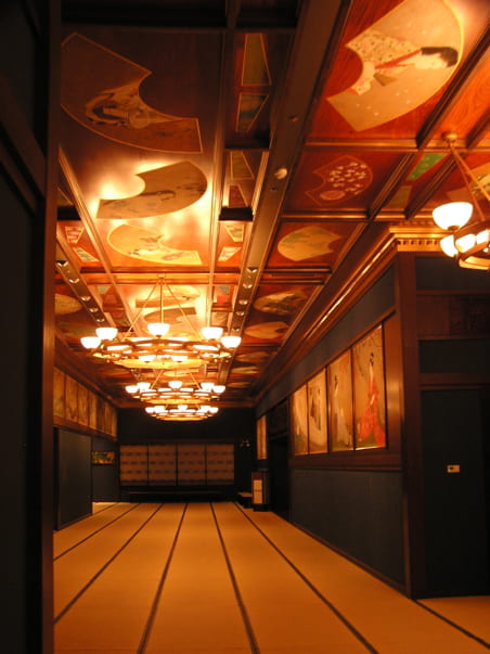 Once nicknamed Ryugujo (竜郡城) or the Palace of the Dragon King of the Sea, Hotel Gajoen Tokyo (ホテル雅叙園) is a lavish hotel complex in Meguro, Tokyo. It is composed of fancy banquet halls, guest rooms, an array of restaurants with international cuisine, a chapel, a shrine, a garden, and an artificial waterfall. Nowadays it is also used for business conferences or for anyone interested in an opulent Tokyo experience. It's almost an art museum, with the entrance hall lined with the latest temporary exhibit, permanent high-relief sculptures of Edo Era women, and paintings on the ceilings.
