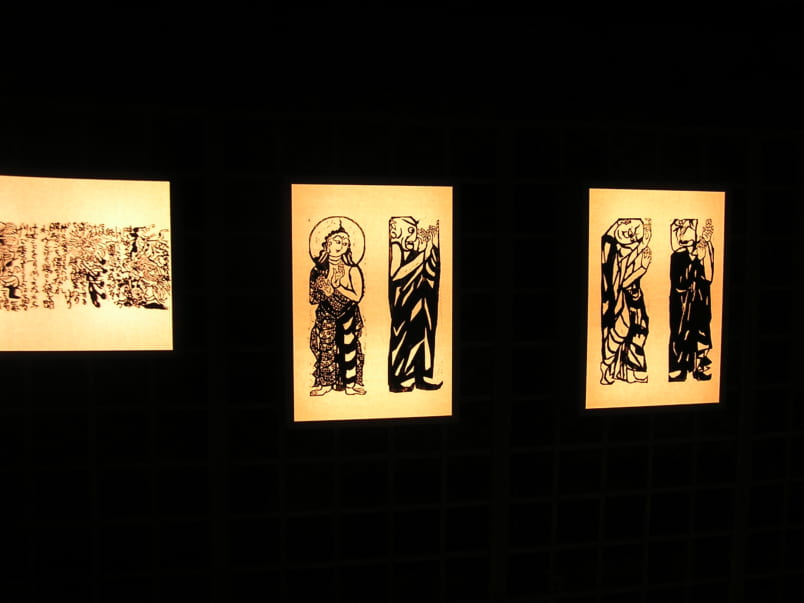 The first room you come to is Jippo no Ma (十畝の間). Here, you'll find a small display of one-figure roof tiles and backlit calligraphy works. Notice the lacquer paneling near your feet.