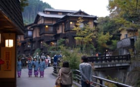 You can enjoy the many hot springs (温泉 or onsen), some are even outside (called rotenburo 露天風呂), just by the river. You can walk around the town, which is very picturesque, and try delicious food.