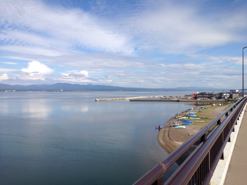 You followed the road to the narrow strip of land between the west shore of Lake Jusanko and the Sea of Japan, where it merged with National Route 12, which took you across a bridge over the narrow inlet of water connecting sea and lake. During the Muromachi/Kamakura period Junsanko was a bustling port but the one you passed by is a forgotten, sleepy, clamming, fishing and off-the-beaten-path tourist destination. Watery Tsugaru plain abruptly ends at the lake and the north stretch of Tsugaru Mountains begins. You rode next to them along the coast and through their foothills to a tidy campground in the tiny village of Nakadomarimachi, where you made camp and spent the night.