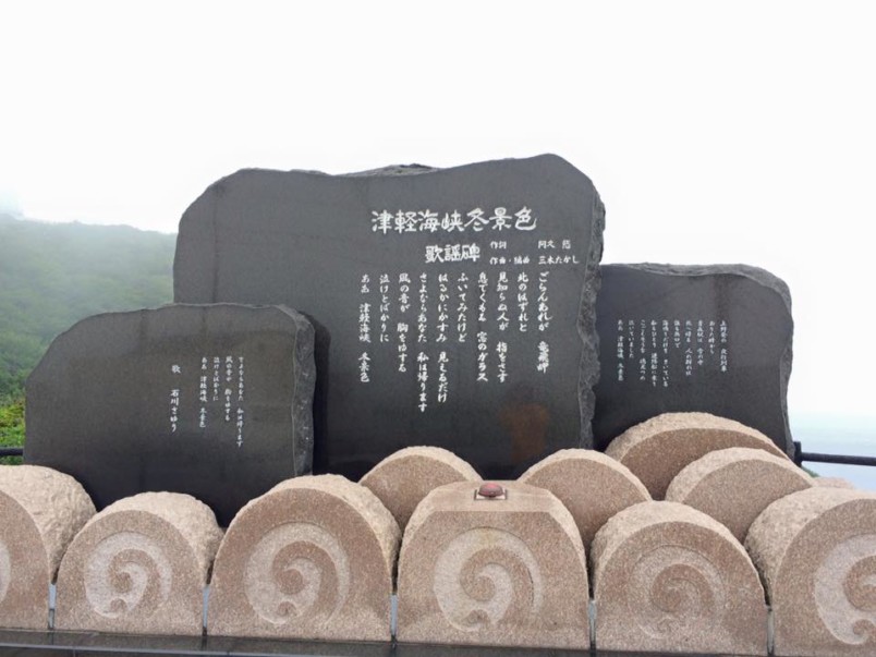 You walk back up the stairs of Route 339 and the song finishes but a few steps later starts again. After reaching the top of the stairs you follow the strains of Ishikawa Sayuri’s Tsugaru Kaikyou Fuyugeshiki, whose lyrics lament the sorrow of parting and the sight of the forlorn, frozen strait in winter, to a scenic lookout with stone benches. At the lookout point a PA system, rigged to black granite stone with the lyrics carved in it, faithfully blasts the song out at high decibels each and every time an intrepid tourist comes by and pushes a little button at its base.
