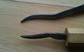 Knives used to carve them are specialized tools called “satou” or “hidari-ba” which are more like tiny scrapers than knives. They look like dental picks for mythical creatures to be used by monstrous dentists. I acquired my first set of satou knives from master carver Kazuaki Nakamura but I needed a knife suited to my individual needs: One that was curved in the opposite direction to the knife included in the set.