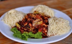 Soumen is a very popular kind of noodle in Japan, especially during the summer season. These are very thin hand-stretched strand like noodles made from wheat flour. The main specialty of this noodle is that it is served cold something which helps to bring down the body temperature in the hot summer months.