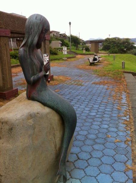 A mermaid statue in Joetsu City.Further south along Niigata Prefecture’s coast one comes across Nozumi Waterfall then Izumozaki Village, home of the poet-monk Ryōkan and the lively seafood market of Teradomari-cho. Next comes the red streets of Joetsu City, a popular place for cherry blossom viewing in season, and another port from where travelers can catch a ferry to Sado Island.