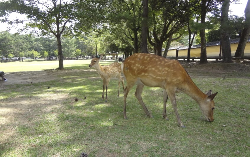 Now this is the part about Nara Prefecture people remember the most and it's hottest tourist spot. A large park in Nara City only a few meters from Kintetsu Nara Station filled with live deer that actually bow directly to you. At Nara Park, you can feed the deer small biscuits and walk among male, female and fawns lurking all around the grass and trees. They can be seen from the center of the park all the way to Todaiji Temple. To protect visitors, the antlers on the males have been removed. But of course they are not always friendly. While attacks by deer are rare, they are prone to get testy or ram at humans so do not try to annoy them. They can be viewed at any time of the year and are all around Nara Park just outside Kintetsu Nara Station.