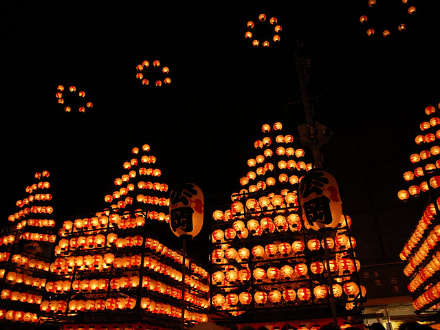 The festival begins on October 4th at the Nihonmatsu Shrine. Before sunset, the shrine priests perform the ceremonial prayers. As ancient chants fill the air and the smoke from incense curls heavenward, the lanterns are lit on seven “floats” with a ceremonial flame. As the last of the setting sun slips away, the sounds of taiko drums and mystical bamboo flute music floats over the shrine and the huge lantern-laden floats begin their slow “sail” through the area.
