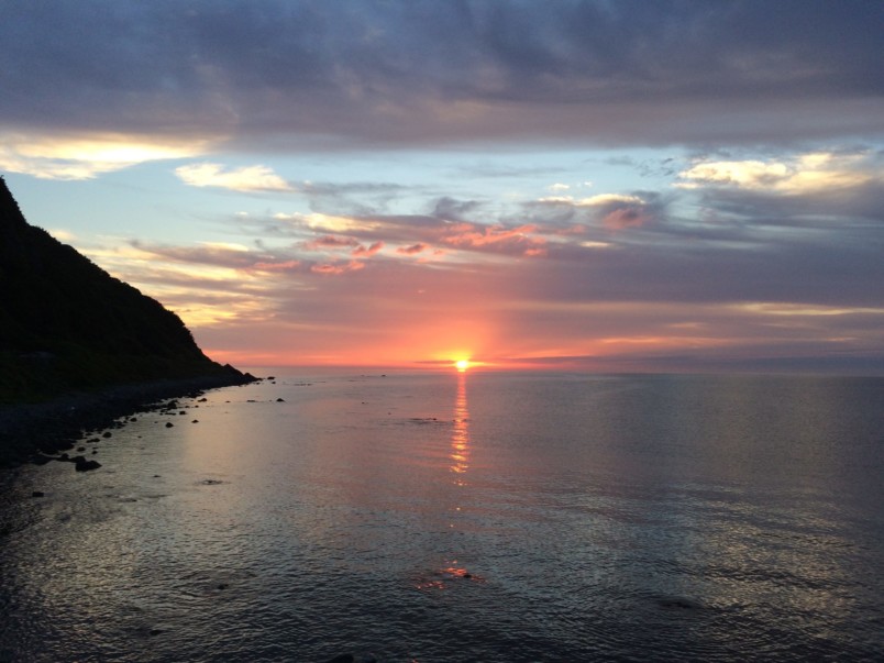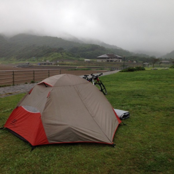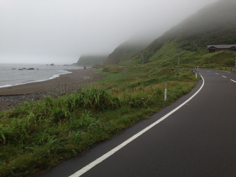 The sky, now battleship grey, not so much meets the sea at the horizon as it just thickens to ashen fog and then thickens further to leaden water. The steam from hot coffee, that you sip from a tin coffee cup, adds welcome warmth to the somber beauty of the cool overcast summer morning. Your camp’s been broken down, your gear has been loaded and after coffee you ride to the camp office to check out. There, an elderly gentleman minding the camp store asks about your destination today. You tell him Tappimisaki and are wished well with a crisp “keppare”, Tsugaru dialect for “gammbate”, which in Japanese means “do your best”.