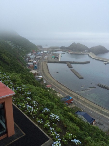 You take your leave and ride north along the coast of Tsugaru Peninsula back on foggy, lonely National Route 339 or Tatsudomari Line Road. Man-made structures along the road are few and relatively far between but gnarled Japanese Black Pines are plentiful. Seagulls high above the roar of the surf squawk searching for a fishy breakfast. About a half dozen or so wooden fishing shacks, from behind broken concrete and tetrapod breakers, are staunchly facing morning whitecaps on the water where the road veers northeast. Here it parts company with the coast until it becomes stairs, after crossing over Tsugaru Mountains, leading down to the Tsugaru Straits where the island of Hokkaido is a mere 20 km away.