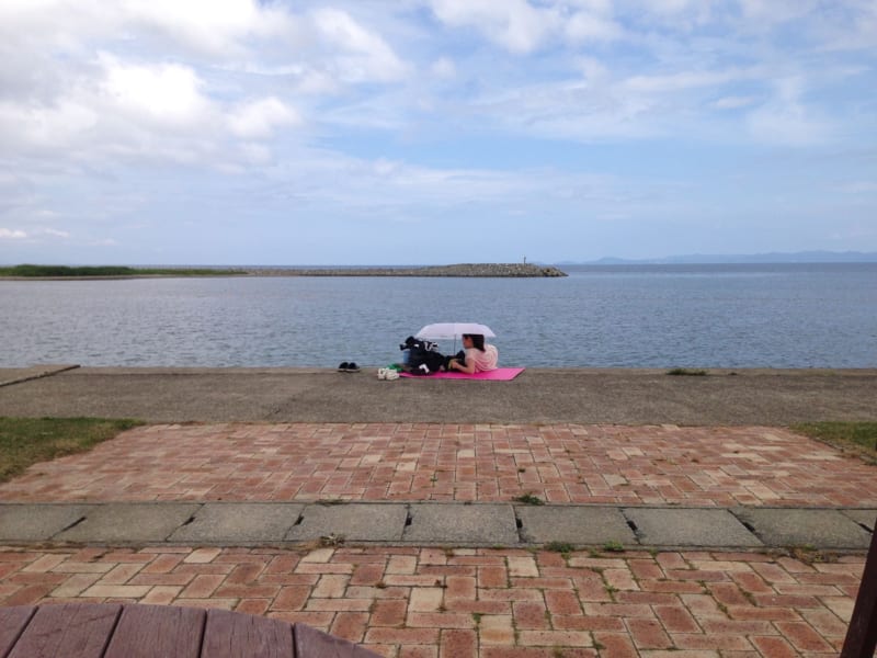 You followed the road to the narrow strip of land between the west shore of Lake Jusanko and the Sea of Japan, where it merged with National Route 12, which took you across a bridge over the narrow inlet of water connecting sea and lake. During the Muromachi/Kamakura period Junsanko was a bustling port but the one you passed by is a forgotten, sleepy, clamming, fishing and off-the-beaten-path tourist destination. Watery Tsugaru plain abruptly ends at the lake and the north stretch of Tsugaru Mountains begins. You rode next to them along the coast and through their foothills to a tidy campground in the tiny village of Nakadomarimachi, where you made camp and spent the night.