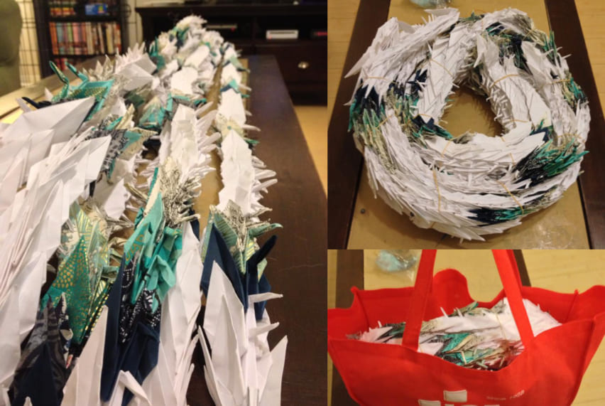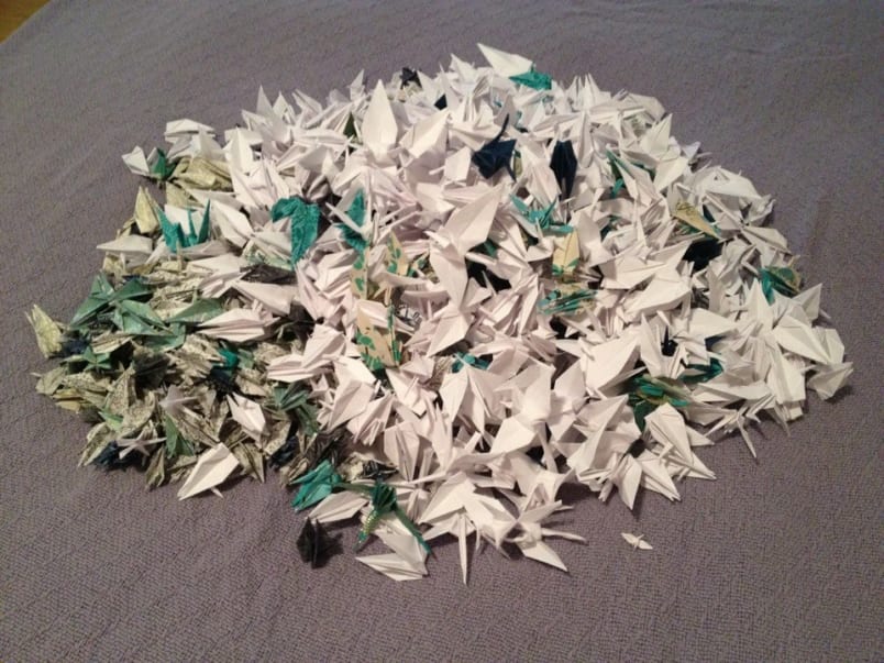 My husband and I were married in a Japanese Garden in South Florida in 2012. Long before the wedding, we committed to the daunting task of folding 1,000 origami paper cranes that would be strung and displayed on an arch behind us during the ceremony. After the wedding the cranes would come with us on our honeymoon to Japan where we would display them at the Children’s Peace Monument in Hiroshima.