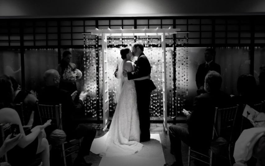 What was it like folding one thousand origami cranes? Not nearly as challenging as you might think! We began the task of folding our cranes in May about four months before the wedding. With only one month to go we still had over 300 to fold, but we redoubled our efforts and managed to finish all 1,000 by the beginning of September. But once the folding was completed, that only meant we still had to string them and deliver them to our florist to be attached to the arch and deliver it to the wedding site. Happily, all 1,000 cranes were folded and strung with ten days to spare! The end result was beautiful, and a very rewarding surprise on the morning of our wedding to see the arch unveiled before the ceremony.