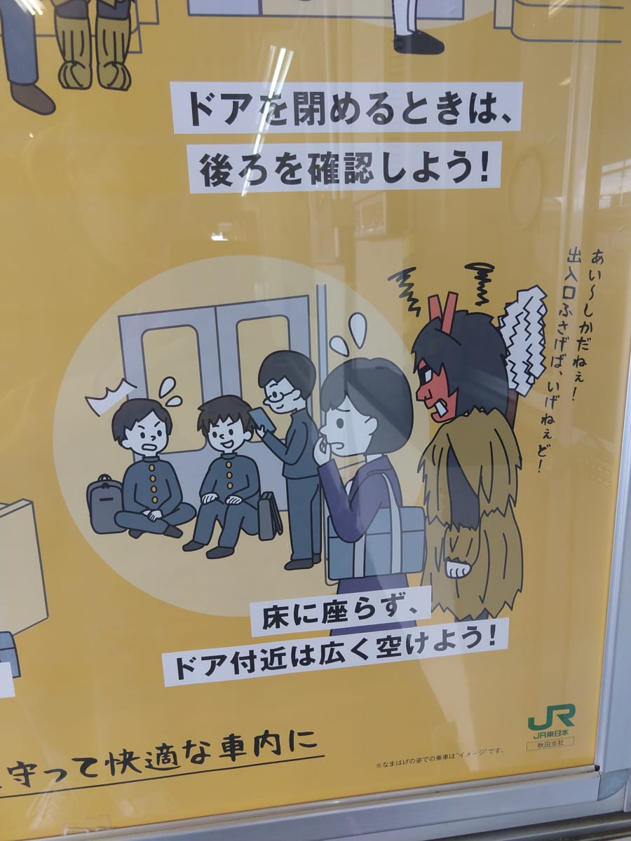 A famous usage of 「ね」in Akita-ben involves Namahage asking "Are there any bad children?!?" Below is a Train ad parodying this famous saying.