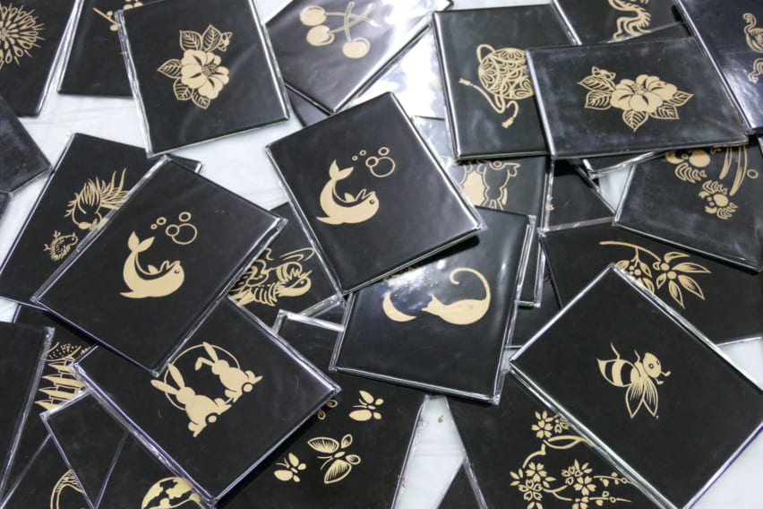Synthetic materials are used at the Kyoto Artisan Workshop instead of the traditional urushi, which is highly toxic and can cause a rash. Instead of real gold powder, a mixture of brass and bronze is used, I was told, and the objects are made of plastic instead of wood for the basic classes.