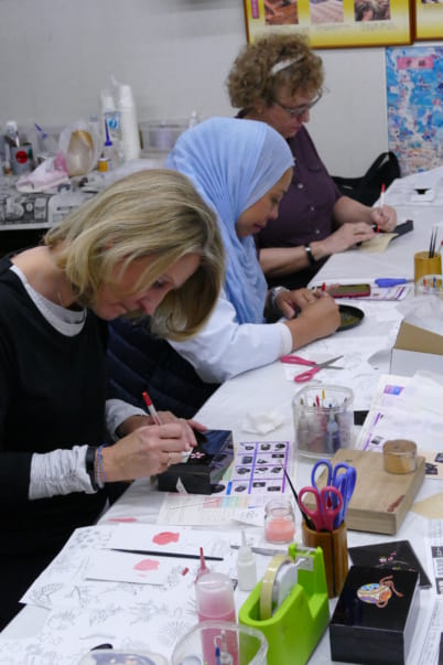 You then trace the design on the object. Next, you paint the traced pattern with urushi, which takes a steady hand and intense focus. Then, colored powder is sprinkled on the piece and set to dry for 20 minutes. Paint is then applied if desired. Plenty of assistance from the staff is available during the process, including the materials preparation as well as the final step of heating the piece for finishing and taking home.