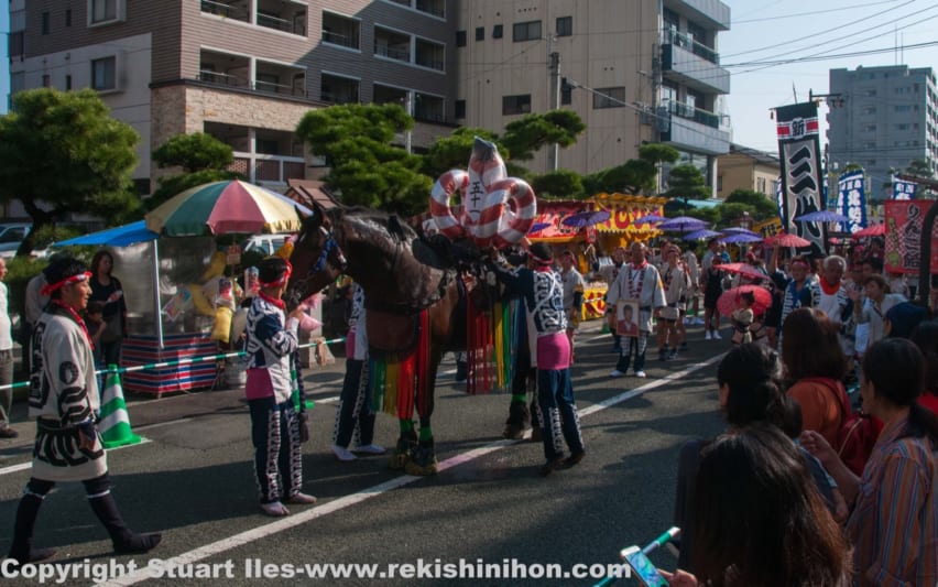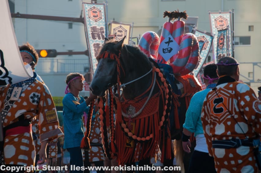 An interesting point is that upper class samurai did not mount their horses in the march, they walked alongside the foot samurai — a ritual which has continued through to today. The horse decorations we see today are thought to have begun about 100 years ago. They now have become much more elaborate, colourful and serious competition between groups (gumi) displaying their horses.