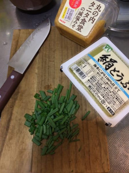 Think of these as the foundational tools to help us embark on our miso journey. Chop the onions and cut the tofu into bite-sized squares. Put about 2-3 cups of water in a saucepan and bring it to a boil.