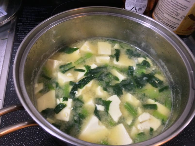From there, add your onions and other vegetables. Personally, having tons of vegetables is key. Although it may not be miso soup in the traditional sense, a lot of greenery is necessary.