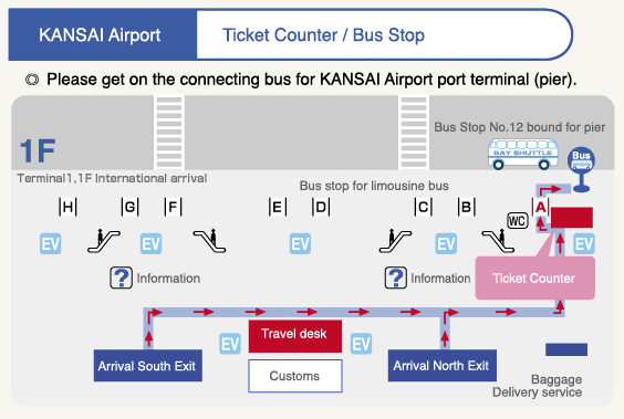 Leaving KIX to go to Kobe on the ferry is even easier than it is to get to KIX via Kobe. International arrivals will just need to turn to their right on the ground floor after passing through the doors beyond customs. Domestic arrivals will need to go to the ground floor and then follow the diagram below for directions how to get to the ferry ticket-vending booth.