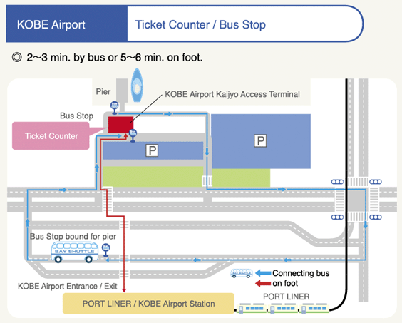 From there, pass through the ticket gates and get on a Port Liner train bound for Kobe Airport (not Kita-Futo). You will arrive at Kobe Airport Station in 18 minutes. From the train station, enter the airport terminal building and follow the signs that direct you to the KIX Ferry. You can either walk through the parking lot to the ferry terminal or take a bus from the curb outside of the airport to the ferry terminal. Here is a diagram of how to walk to the terminal and find the bus in Kobe.