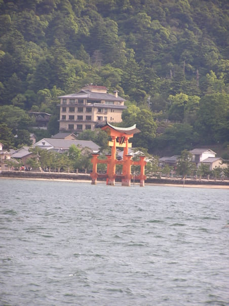 Itsukushima Shrine (厳島神社) is located off the coast of Hatsukaichi City (廿日市市) in Hiroshima Prefecture (広島県), on the island of Miyajima (宮島). The O-torii Gate (大鳥居) 200 meters out from the shrine is 16.6-meters high, weighs about 60-tons, and has six camphor wood pillars.