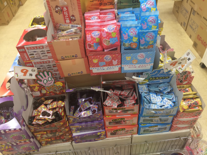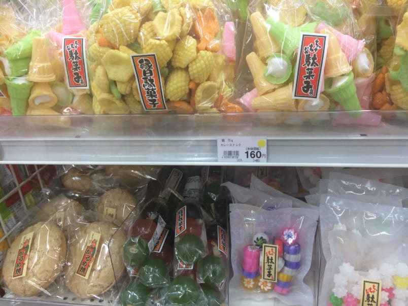 駄菓子屋, pronounced dagashi-ya–which are small-time retro candy stores carrying a variety of cheap snacks and goods, similar to penny candies in America. These candy shops were famous in Japan before the age of convenience stores and vending machines, but even today there are still many dagashi-ya around the country. Cheap dagashi snacks can also be found in convenience stores and supermarkets around Japan. So next time you find yourself in Japan, in addition to visiting a dagashi-ya, check out any convenience store and you will surely find a small section in the snack and candy isle with treats between 10-150 yen.