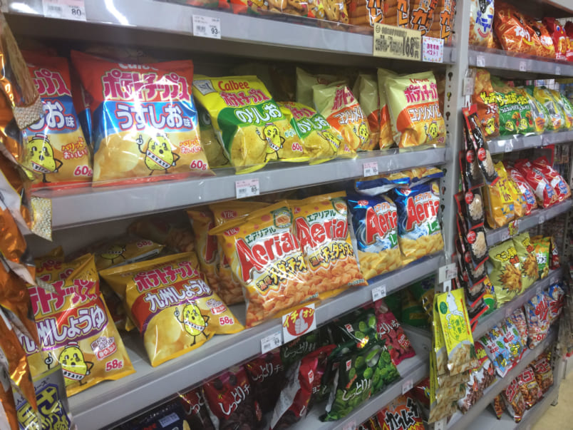 Rows of chips–flavors include salt, seaweed, consommé, Kyushu soy sauce, and cheddar cheese