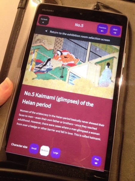 The iPad guide is packed with translations. Credit: Donna SheffieldThe Tale of Genji is set in the Heian period, which lasted from 794 to 1185. Don’t know much about the Heian period? Head for the Heian Room. Here you can learn more about what life was like for the Japanese nobility. What’s the story behind the elaborate 12-layered kimono they wore? How did they travel? What did they do with their free time? A life-size model of the Genji characters in costume brings one of the story’s scene to life, and touch screens, display cases, and videos around the room invite you to learn more about this fascinating era.