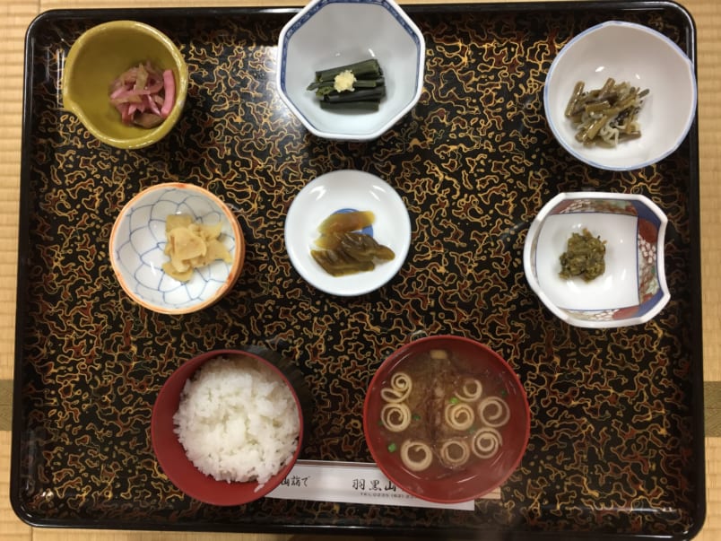 Vegetarian breakfast at temple lodge includes wild mountain vegetables
