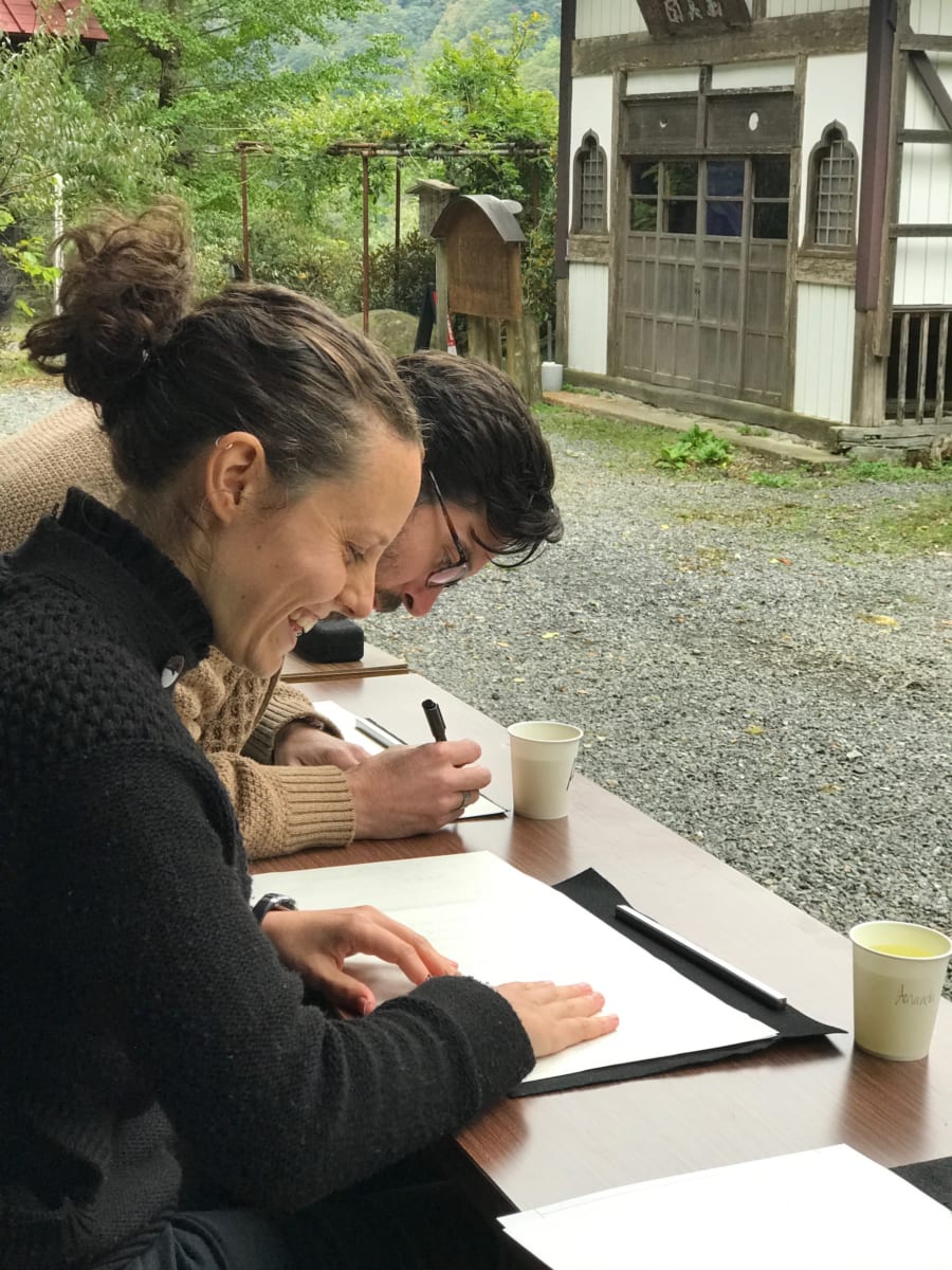 Put your bags down near a futon and head out to the main hall where you will be offered coffee or green tea. If the weather is nice you will be seated at a low table on a long wooden porch outside with a copy of the heart sutra to trace and very little instruction. It doesn’t matter. The copying of the sutra is a meditation and doesn’t need to be done perfectly. Tip: It goes right to left, top to bottom. If the weather isn’t nice, you will do this in the main hall.