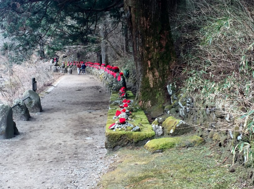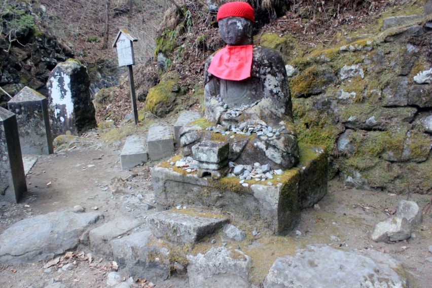The Kanmangafuchi- Abyss (憾満ヶ淵周辺) is a gorge that was formed from an eruption from Mt. Nantai along the Daiya River. The gorge, located in central Nikko, is known not only as an area for a nice stroll through its beautiful scenery but also, as a sacred spot. Inside the gorge there are rows of stone statue Buddhist monks called Bake-Jizou (化け地蔵). Bake (BAH-ke) meaning ghost or apparition and Jizou (GEE-zou) meaning Ksitigarbha, a Buddhist monk who is the patron guardian of children as well as the protector of lost souls and travelers. It’s very common to see Jizou statues in many areas, especially along roadsides or mountain bases. Most of the time the Jizou are seen with red cloth tied around their necks and a cap on their head. In Japanese folklore, the color red is used to expel demons and diseases.