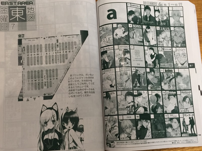 One of the most important things to obtain in Comiket is the official Comiket catalogue. A gargantuan text the size of a phone book, the Comiket Catalogue lists the convention policies and rules and a map of the building. Its main purpose is to serve as a list of which doujinshi circle or individual are tabling on which day, which is often categorized by the Japanese kana writing system and a number, and by the day in which that artist is tabling during the three-day convention. The catalogue book typically cost around 2000 yen or more, depending on where one buys it. You can obtain it at bookstores, specialty stores, and directly at Comiket, but can be sold out quickly due to its limited printing.
