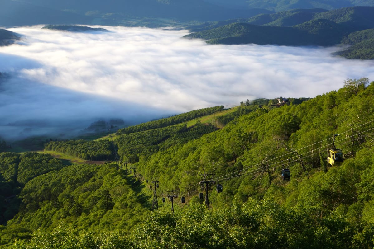 Unkai Terrace Hokkaido. On top of Tomamu, central Hokkaido, there is a sightseeing platform that's rather unique. From there, people can watch a "Sea of clouds", which is unkai in Japanese. In fact, the valleys and the peaks in that area get entirely covered by thick clouds so that one has the impression to float in the air. Best time of the day is before sunrise. This phenomenon depends on the weather conditions, and only happens during the warmer months, so plan ahead if you want to check it out, otherwise just enjoy the lush green mountains all around Hokkaido.