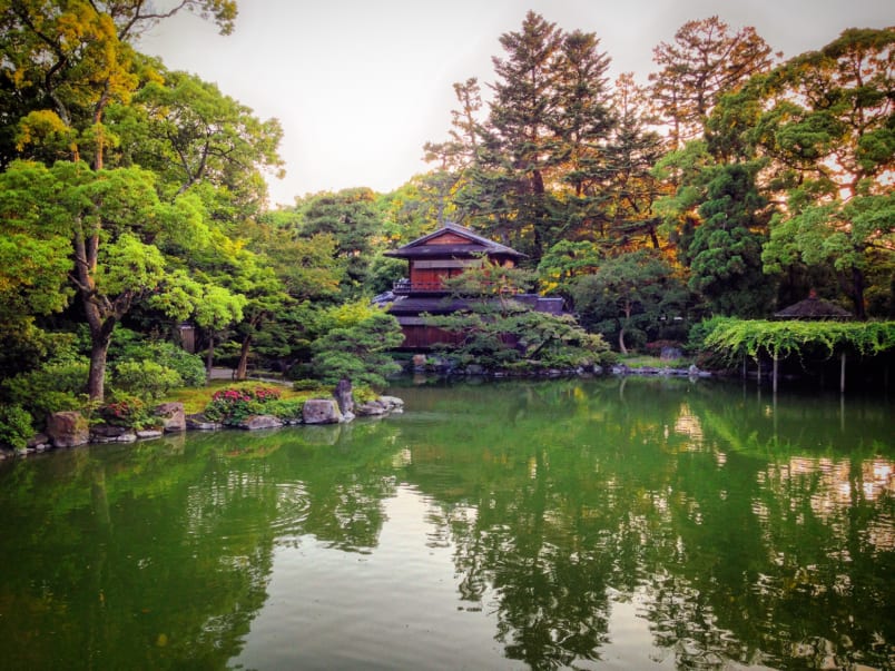 Enter the “Former Kujo Residence”! Set beside a pond on the southern end of the Imperial Palace Gardens, the sight of the pavilion reflected in the green waters and equally green gardens really does make it feel like the forgotten kin of the Golden and Silver Pavilions. Indeed, the color of the building will put you in the mind of bronze, so I personally call this place “doukakuji” (the Bronze Pavilion)! But don’t just take the similarities on my word: like it’s more popular counterparts, it too is the former home of a revered family in Kyoto, so it has the history to back it up too. The bridge across the pond provides the best views, and there’s also a little shrine that pokes out onto the water that’s worth a visit. If you’re lucky you may also get a greeting from the local cats.