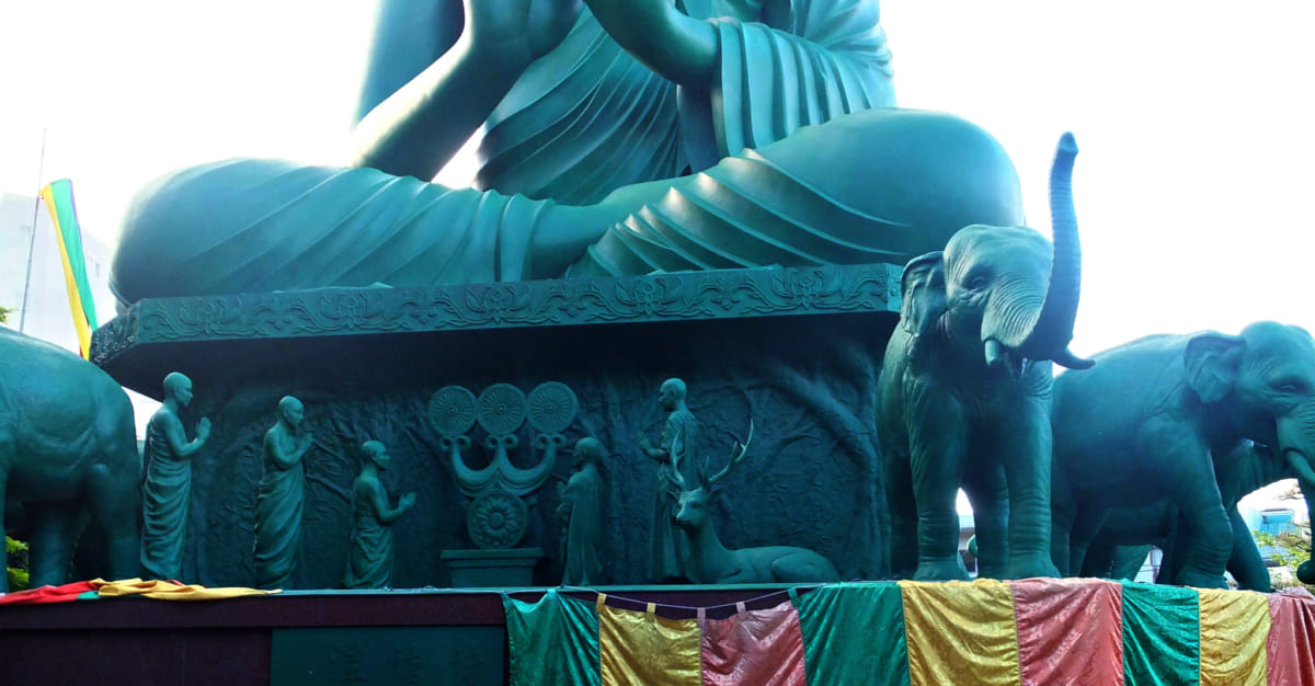Opposite to this place, we could see a cemetery. The statue of Lord Buddha found here has a green color with closed eyes and the palms holding the 'dharma chakra pravarthana mudra' (symbol meaning the wheel of justice). The lips, eye and a spot on the forehead of the statue are golden colored. This 10 meter tall statue also holds some small statues of elephants around it. At the foot of the Buddha statue there are some monks with folded hands, a deer, peacock, Ashok Chakra, etc. The palms of this Buddha holding the mudra has a golden colored icon of Ashok Chakra on it. A small incense burner is placed in front of the statue. An enlarged left palm of this statue could be seen placed opposite to the Buddha statue over a rock. The Buddha statue, the palm as well as the Shiv Linga are bronze made. The small yard around this statue has an area with thick bamboo trees. There are some cat and dog sculptures seen along with this. It is a grave of the dead pets.