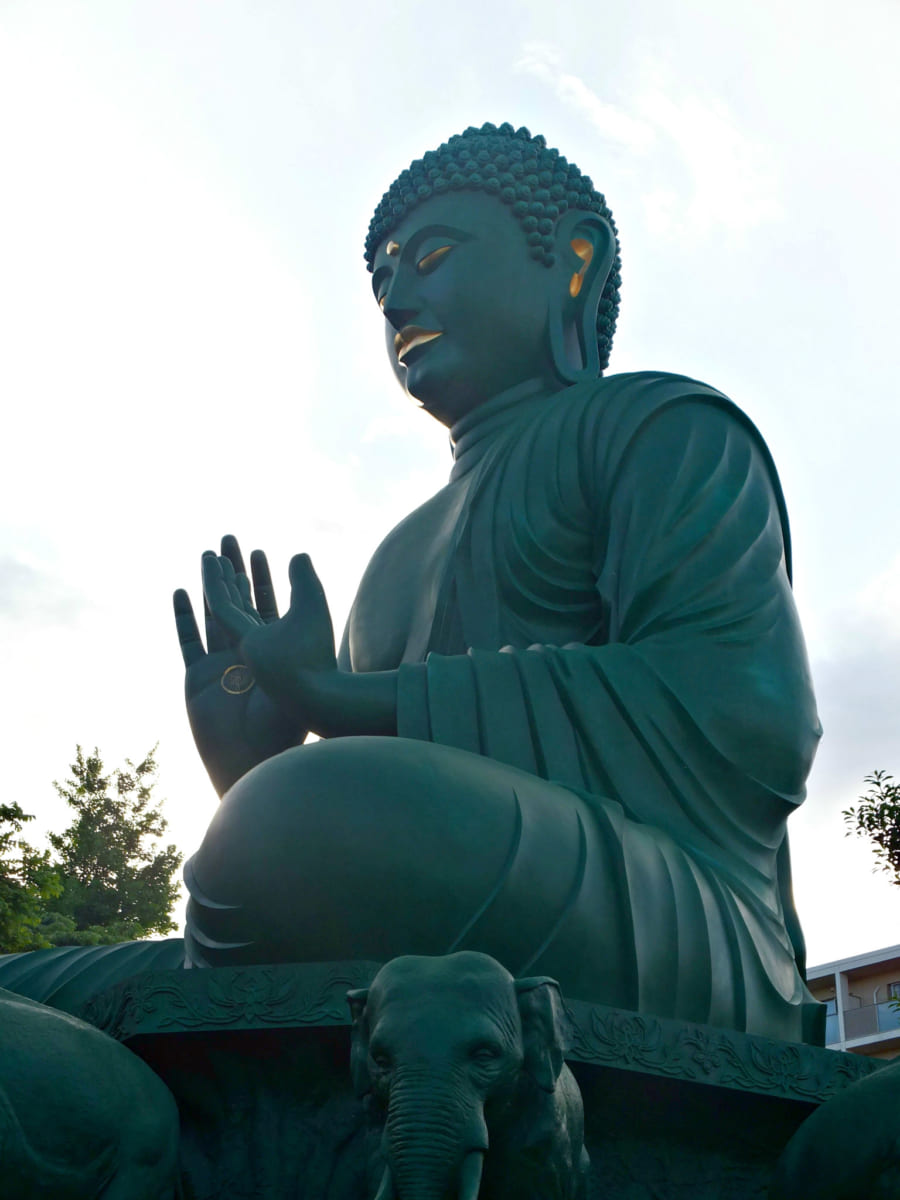 The huge Buddha statue is situated at the foot of the temple yard area which is covered with trees. A stone pavement with a number of stairs leading to this place directs us to the Buddha statue. On both sides of this path, we could find a bamboo forest along with some other trees.