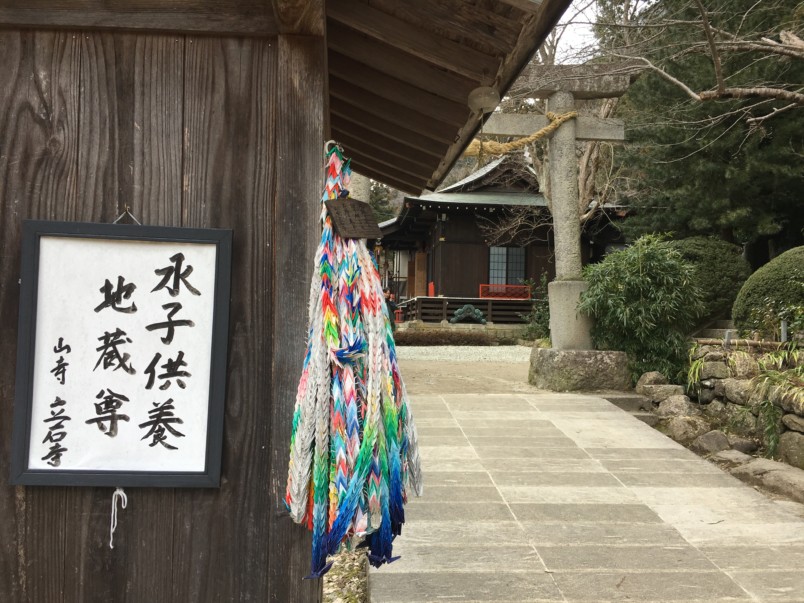 Proceed left through an area dedicated to the “water children,” or those lost to miscarriage, and on through a Shinto gate.