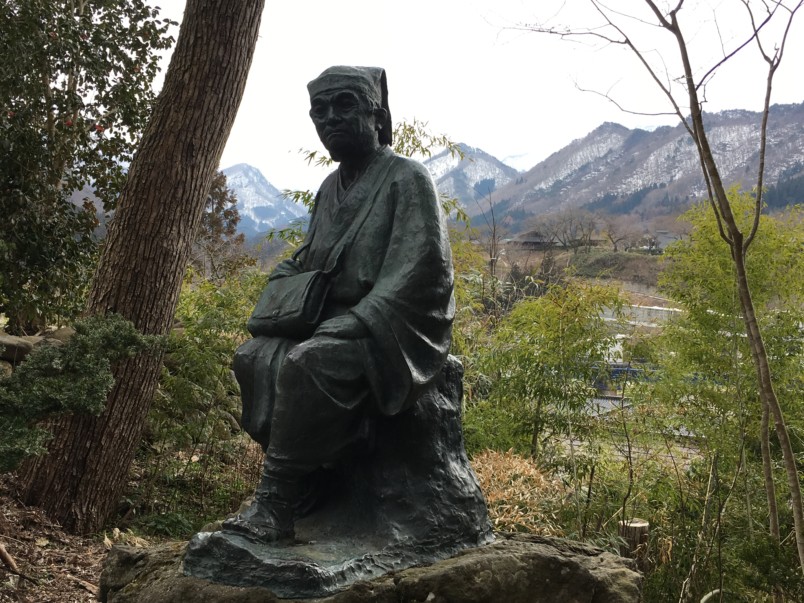 The two statues on your left are of Basho, Japan’s master of haiku poetry, and his disciple, Sora. Basho penned one of his most famous poems here in Yamadera, and its words are engraved on the stone between the statues: