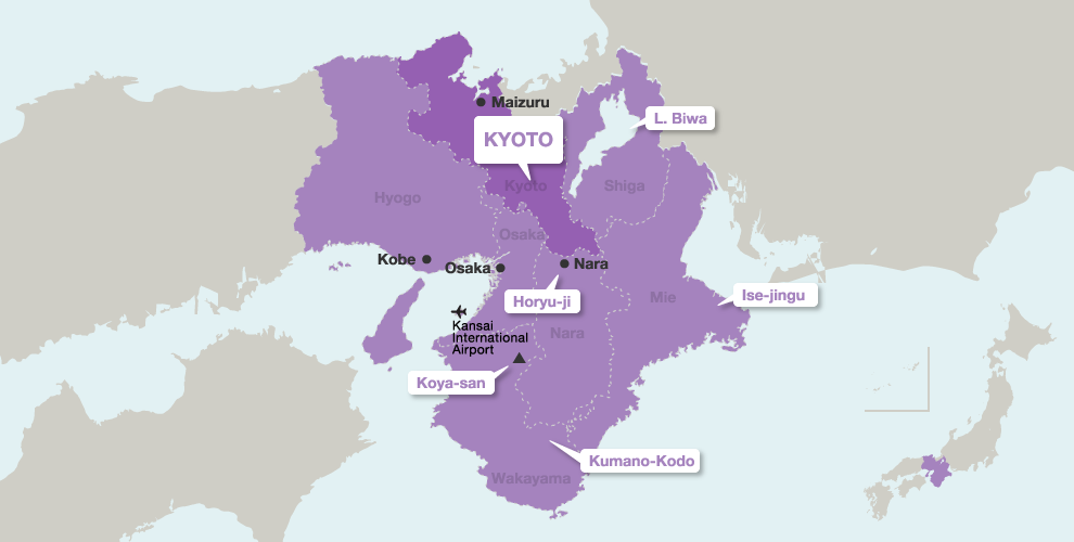 Rich in culture and history, the Kansai area includes seven prefectures: Mie, Nara, Wakayama, Kyoto, Osaka, Hyogo and Shiga. Kyoto, Nara and Osaka are popular tourist destinations.